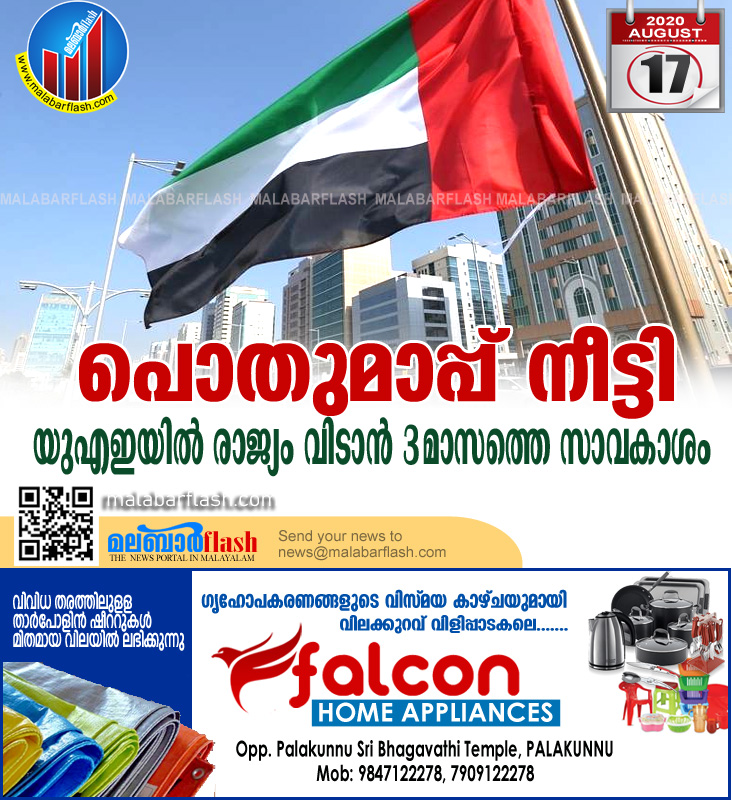 ദുബൈ: പൊതുമാപ്പ് കാലാവധി മൂന്നു മാസത്തേയ്ക്ക് കൂടി നീട്ടി യു.എ.ഇ. മാര്ച്ച് 1 ന് മുമ്പ് വിസാ കാലാവധി അവസാനിച്ചവര്ക്ക് യുഎഇ വിടാന് നവംബര് 17 വരെ സമയം അനുവദിച്ചു,[www.malabarflash.com]