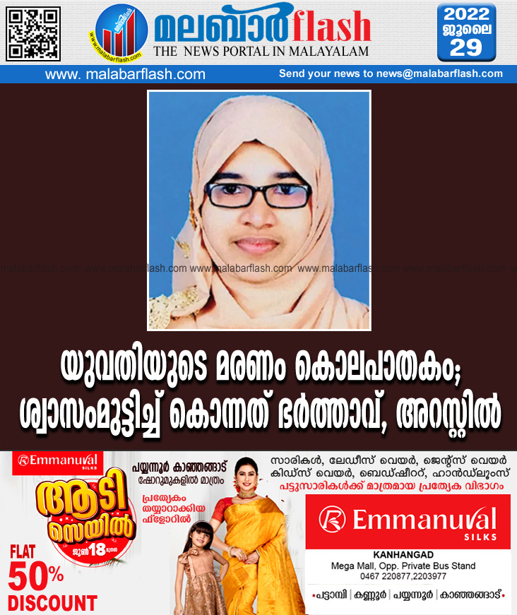 കൊല്ലം: കുരീപ്പള്ളി സ്വദേശിയായ യുവതി ഭര്ത്തൃഗൃഹത്തില് മരിച്ച സംഭവം കൊലപാതകമാണെന്ന് പോലീസ് കണ്ടെത്തി. ഭര്ത്താവ് ശ്വാസം മുട്ടിച്ചതിനെത്തുടര്ന്നാണ് യുവതി മരിച്ചത്.[www.malabarflash.com]