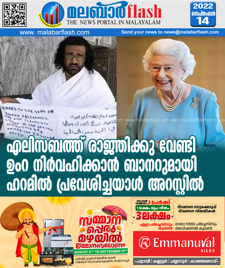 മക്ക: അന്തരിച്ച ബ്രിട്ടനിലെ എലിസബത്ത് രാജ്ഞിക്ക് വേണ്ടി ഉംറ തീർഥാടനം നിർവഹിക്കാൻ മക്കയിലെത്തിയയാൾ അറസ്റ്റിൽ. താൻ രാജ്ഞിക്കു വേണ്ടി ഉംറ നിർവഹിക്കാൻ എത്തിയതാണെന്ന് അറിയിക്കുന്ന വീഡിയോ ഇയാൾ പങ്കുവെച്ചിരുന്നു. ഇത് സൗദിയിൽ വ്യാപകമായി പ്രചരിക്കുകയും നിരവധി പേർ ഇയാൾക്കെതിരെ നടപടിയാവശ്യപ്പെട്ട് രംഗത്തെത്തുകയും ചെയ്തു. ഇതിനു പിന്നാലെയാണ് അറസ്റ്റ്. ഇയാൾ യെമൻ പൗരനാണെന്ന് സൗദി അധികൃതർ അറിയിച്ചു.[www.malabarflash.com]
