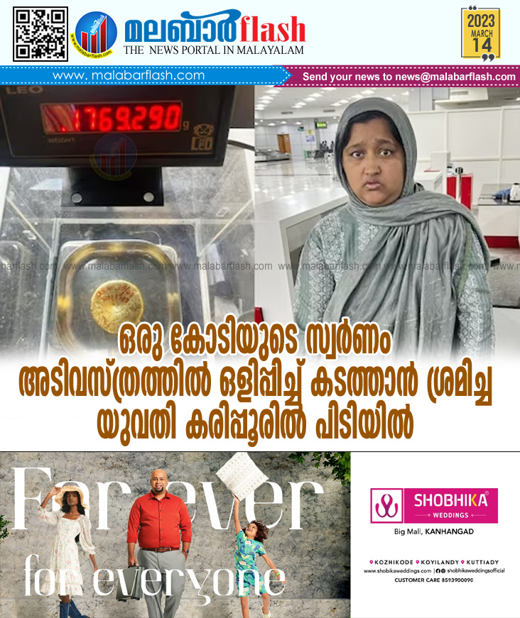 കോഴിക്കോട്: കരിപ്പൂരിൽ ഒരു കോടി രൂപ വില മതിക്കുന്ന സ്വർണവുമായി യുവതി കസ്റ്റംസ് പിടിയിലായി. കോഴിക്കോട് നരിക്കുനി സ്വദേശിയായ അസ്മാബീവിയാണ് അടിവസ്ത്രത്തില് സ്വര്ണ്ണം ഒളിപ്പിച്ച് കൊണ്ടുവന്നത്. കഴിഞ്ഞ ദിവസം രാത്രിയാണ് നരിക്കുനി സ്വദേശിനി അസ്മാബി കരിപ്പൂര് വിമാനത്താവളത്തില് ഇറങ്ങിയത്. ദുബായില് നിന്നാണ് ഇവര് കരിപ്പൂരിൽ എത്തിയത്.[www.malabarflash.com]