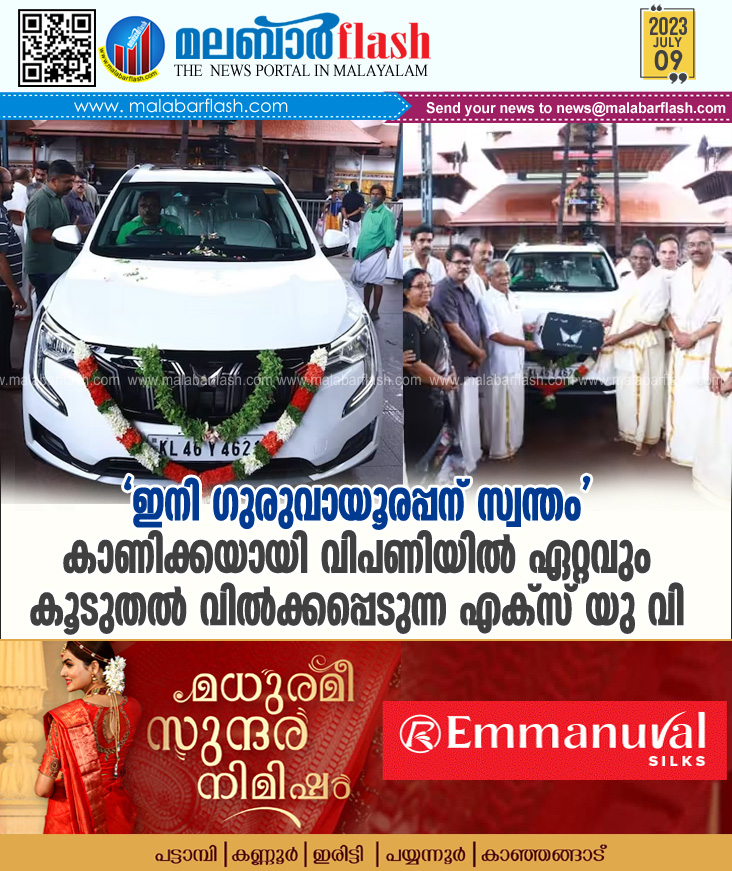 തൃശുർ:  ഗുരുവായൂരപ്പന് വഴിപാടായി മഹീന്ദ്ര ആൻറ് മഹീന്ദ്രയുടെ ന്യൂ ജനറേഷൻ എക്സ് യു വി കാർ  മഹീന്ദ്രയുടെ ഏറ്റവും പുതിയ മോഡലായ XUV700 AX7 Automatic കാറാണ് സമർപ്പിച്ചത്. വാഹന വിപണിയിൽ  കൂടുതൽ വിറ്റഴിക്കപ്പെടുന്ന വാഹനമാണിത്.[www.malabarflash.com]