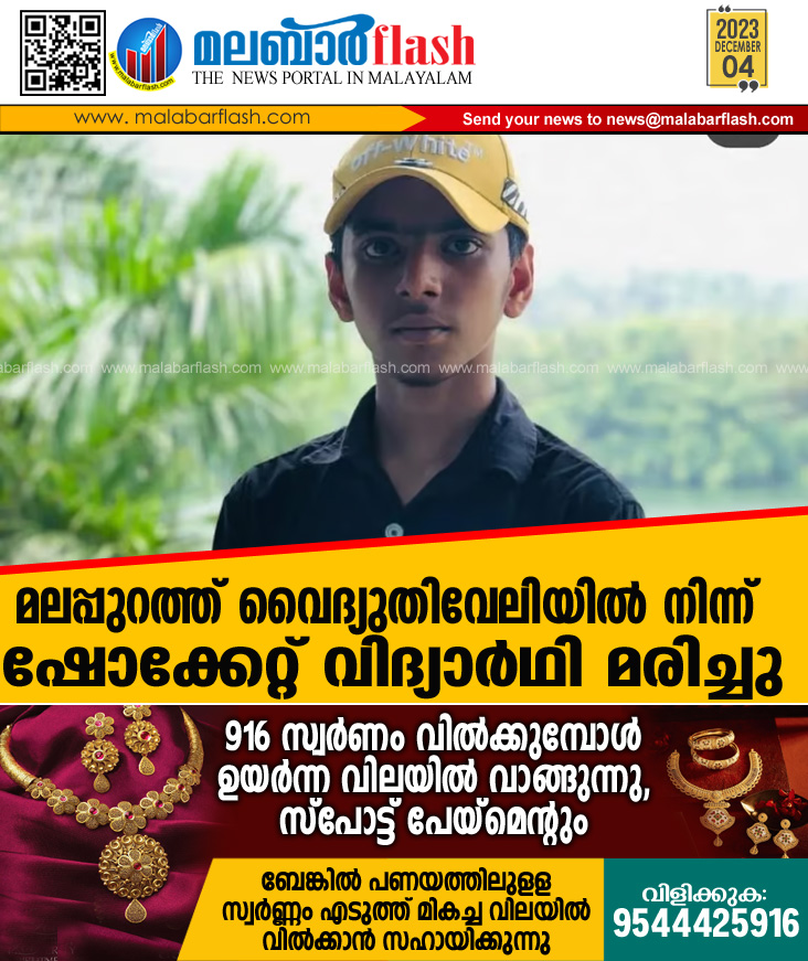 മലപ്പുറം: മലപ്പുറം കിഴിശ്ശേരിയില് വൈദ്യുതി വേലിയില് നിന്ന് ഷോക്കേറ്റ് വിദ്യാര്ഥി മരിച്ചു. കുഴിഞ്ഞൊളം സ്വദേശി വെള്ളാലില് അബ്ദുറസാഖിന്റെ മകന് സിനാന് (17) ആണ് മരിച്ചത്. കൂടെ ഉണ്ടായിരുന്ന സുഹൃത്ത് ഷംനാദിന് (17) പരിക്കേറ്റു. പന്നി ശല്യം തടയാന് സ്ഥാപിച്ച വൈദ്യുതി വേലിയിലാണ് അപകടം ഉണ്ടായത്. ഇന്നലെ രാത്രി 10മണിയോടെ ഇരുവരും കളികാണാന് പോയി തിരിച്ച് വരുന്നതിനിടയിലാണ് സംഭവം.[www.malabarflash.com]