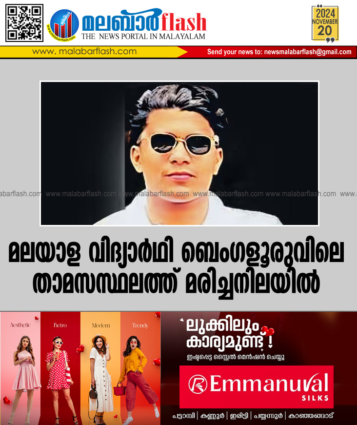 ബെംഗളൂരു: വയനാട് സ്വദേശിയായ ബിരുദ വിദ്യാർഥിയെ താമസസ്ഥലത്ത് മരിച്ച നിലയിൽ കണ്ടെത്തി. മേപ്പാടി തറയിൽ ടി.എം.നിഷാദിന്റെ മകൻ മുഹമ്മദ് ഷാമിൽ (23) ആണ് മരിച്ചത്.[www.malabarflash.com]